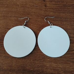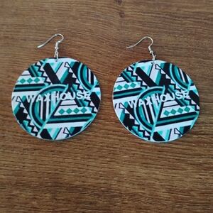 Make a bold statement with these striking round drop earrings! Featuring a vibrant teal, black, and white geometric tribal pattern inspired by African wax prints, these lightweight flat dangle earrings are perfect for adding a pop of culture and color to any outfit. Finished with classic silver-tone French wire hooks.