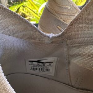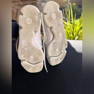 Nike high-top sneakers with a knit upper. Full lace-up design and padded collar. Subtle Nike logo on the tongue. Neutral cream colorway for versatile wear.