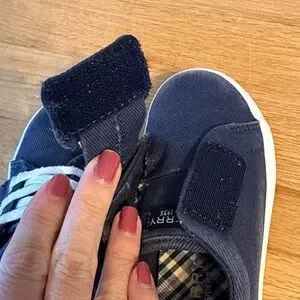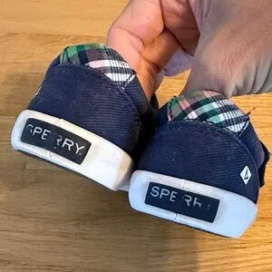 1 pair canvas sperrys, navy blue canvas fabric with fun plaid contrasting detail. faux laces with a velcro closure for easy on and off capability. great for dressing up or down. size 8.5