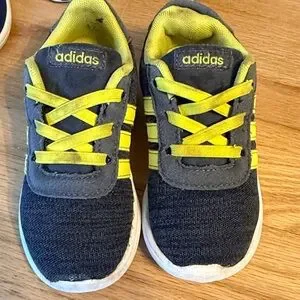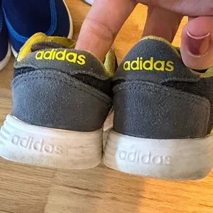 1 pair adidas slip on sneakers, charcoal grey with contrasting neon details. faux elastic laces. size 8