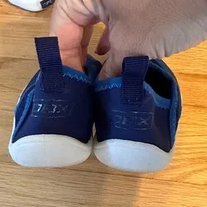 1 pair mesh slip on water shoes, navy blue with contrasting bright blue binding detail, size 9.