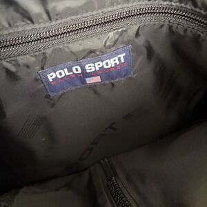 The Vintage Ralph Lauren Polo Sport Backpack is a classic piece from the 90's with a blue and black color scheme, featuring a solid pattern and zip closure. Made of nylon with a canvas fabric type, this medium-sized backpack has double handles and adjustable straps for comfortable use. It is perfect for travel, casual occasions, and school, with inner and outer pockets for organization. The Ralph Lauren Polo Sport branding and vintage design make it a stylish and functional choice for those looking for a blend of retro and modern aesthetics.