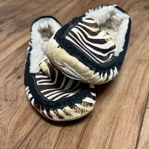 Stylish UGG loafers with zebra pattern. Soft interior for comfort.