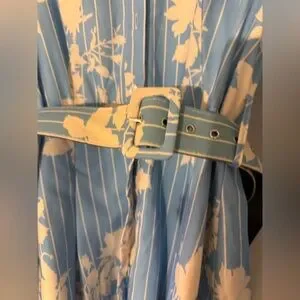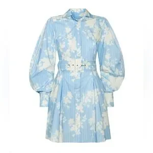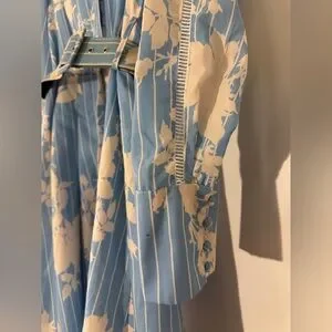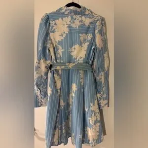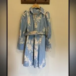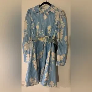 Chic long sleeve dress with floral pattern. Light blue fabric with elegant design. Perfect for stylish occasions. Worn once.