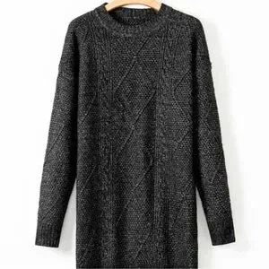 Stylish black sweater dress. Features cable knit design. Perfect for fall and winter. Pair with boots for a chic look.