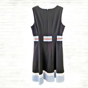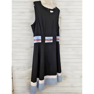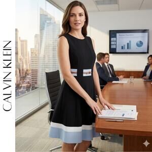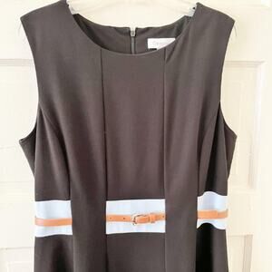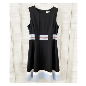 Classic Calvin Klein fit & flare dress in black with subtle blue and white stripe detail. Features a sleeveless round neckline, structured pleating, and a flattering belted waist. Fully lined with back zip closure. Polished and versatile—ideal for office to evening wear. NWOT.