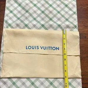 Elegant cream dust bag featuring a bold blue Louis Vuitton stamped logo.