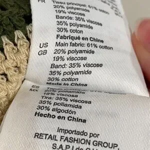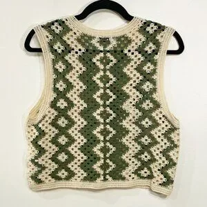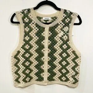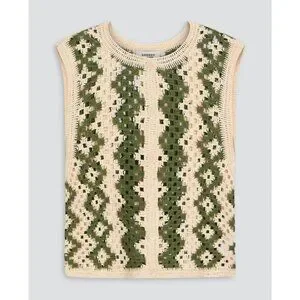 Sandro Henrika vest/top featuring a crewneck, button-front closure, unlined, open-work design, geometric crochet with two-tone chevron pattern, and a cotton blend yarn in ecru and olive green.