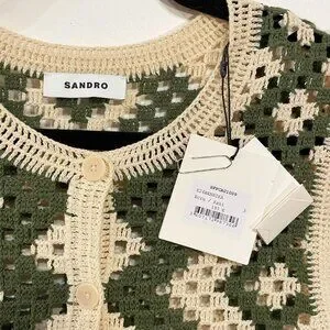 New Sandro Henrika Geo Crochet Vest Ecru Olive Large $295