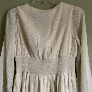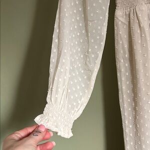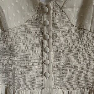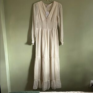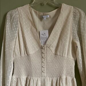 NWT Patrons of Peace Altura Dress. This dress is a cream-colored, full-length maxi dress featuring a Swiss dot (or clip dot) pattern on sheer fabric. Key design elements include a deep V-neckline, a smocked bodice with decorative front buttons, and long puff sleeves with elasticized cuffs.