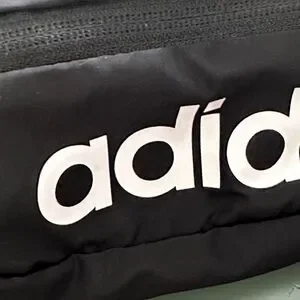Sleek adidas waist pack in black. Prominent white logo on front. Dual zip pockets with gold hardware. Adjustable strap for hands-free wear.