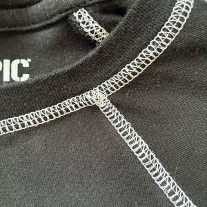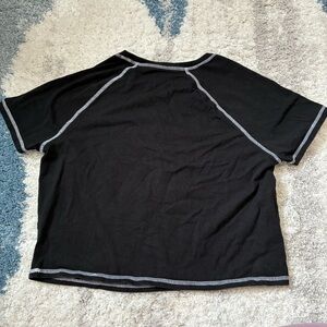 Hot Topic "Damaged Teddy Bear" cropped raglan T-shirt, which features white contrast stitching and a graphic of a stitched, worn-out teddy bear