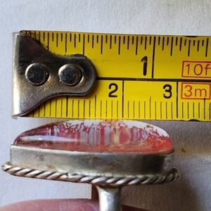 This exquisite ring showcases a shimmering dragon breath pink teardrop stone set in a polished sterling silver band ring is size 8.5. A perfect accessory to elevate your style.