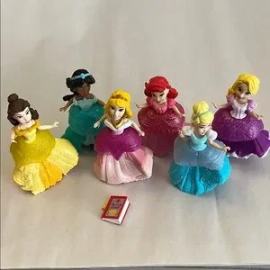 Six Disney princess dolls with glittered gowns. Bright color variety for imaginative play. Small book accessory included. Collectible toy set by Disney.