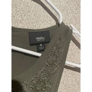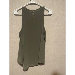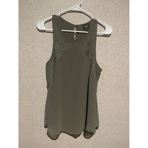 Express olive tank top with delicate lace trim. Lightweight and flowy for all-day comfort. Sleeveless silhouette with a keyhole back for a polished finish. Machine washable for easy care.