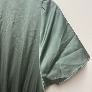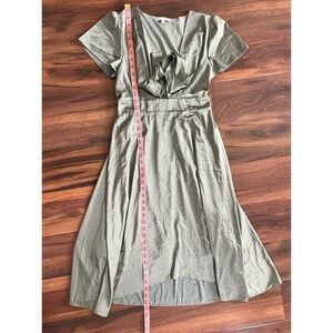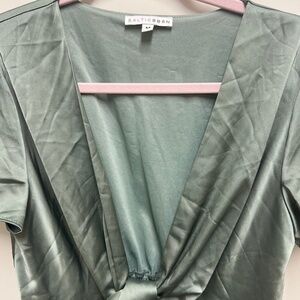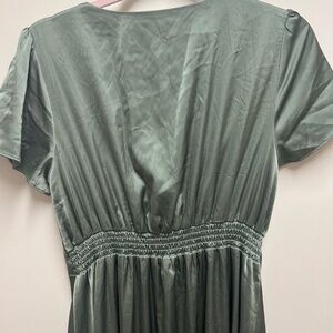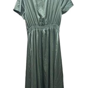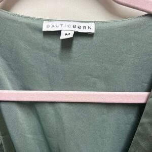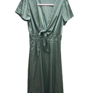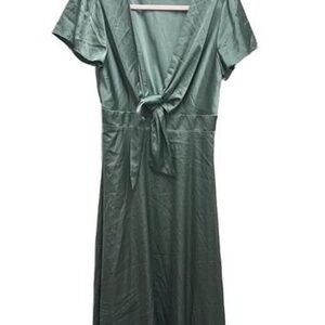 Elegant Baltic Born Poppy Satin Midi Dress in a beautiful sage green. This dress features a flattering V-neckline with a twisted knot detail at the bust, short flutter sleeves, and a flowing midi-length skirt. Made from smooth satin fabric, it offers a luxurious feel and a chic silhouette perfect for special occasions, bridesmaids, or evening wear. Excellent pre-owned condition, no visible flaws.