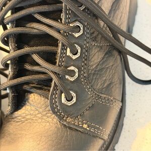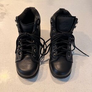 Tough, iconic, and built to ride — these Harley-Davidson Motorcycles black leather lace-up boots are a staple for any moto-inspired wardrobe. Featuring the signature Bar & Shield emblem on the tongue and heel tab, chunky lugged outsole with the classic orange HD medallion, and silver speed hooks for fast lacing. The exterior leather is in great shape with strong structure and minimal sole wear.