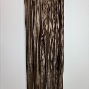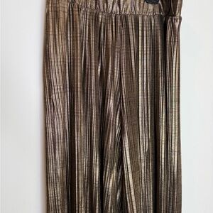 Shimmering metallic wide leg pants. Elegant pleated design. Perfect for evening wear.