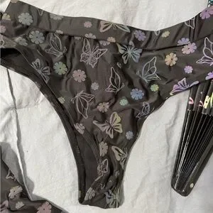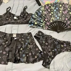 Chic black ensemble with colorful butterfly and floral prints. Comes with a matching fan. Ideal for festivals. Includes Top Skirt Pantie & Fan. * Worn Once*