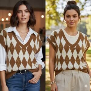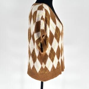 Retro-inspired argyle knit sweater vest from Free People’s “Through the Motions” collection. Soft, cozy fabric with a relaxed fit and v-neckline, perfect layered over tees or blouses or for an off the shoulder standalone look Brown, cream, and subtle green diamond pattern gives it classic, stylish versatility.