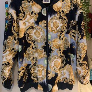 I love the shell /gold pattern on this vintage bomber jacket! Reminds me of the Little Mermaid, Atlantis or a seaside casino Think this is an 80s brand, and gives that vibe Thin material in good second-hand condition. Inner lining is a bit more silky (polly cotton maybe?) while the outer shell is more of a thin cotton... think perfectly worn-in (but not pilling!!) bed sheet lol No size tag, but would say it's a L/ maybe an XL? Looks cute oversized on a S or M as well! feel free to make an offer!