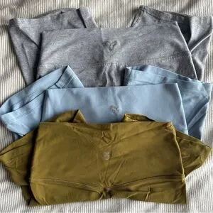 Comfortable athletic shorts by TNA. Includes light blue, light grey, and olive green. They’re three different fabrics, the light blue are more of a cottony- soft fabric. The light grey shorts are more of a thick fabric and the olive green fabric resembles their new butter shorts. All are a size small and super stretchy