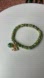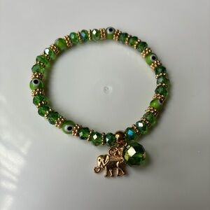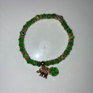 Hand-strung stretch bracelet. Faceted green crystal beads with gold spacer accents. Includes green glass charm and a gold elephant pendant. Lightweight and eye-catching.