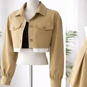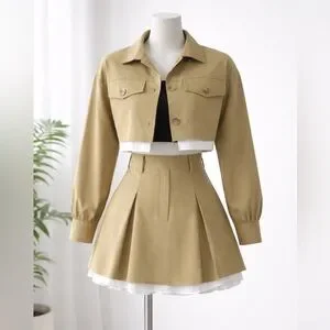 Featuring a cropped button-front jacket with structured pockets and a tailored collar, paired with a high-waisted pleated mini skirt, this set blends preppy sophistication with contemporary edge. The subtle layered hem detail adds dimension and movement, making this outfit stand out from basic sets.