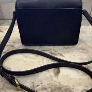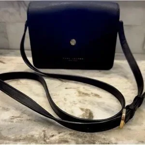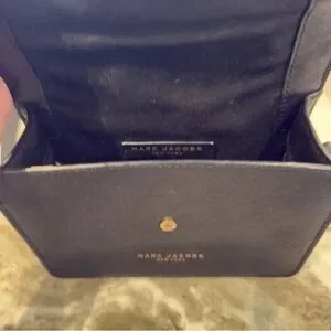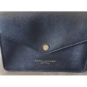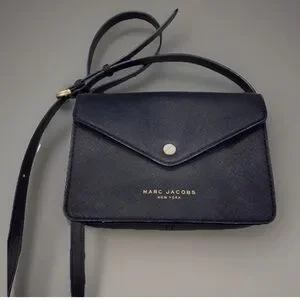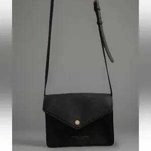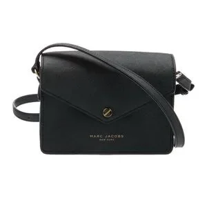 Authentic Marc Jacobs black saffiano leather envelope crossbody bag featuring a structured silhouette and elegant gold-tone logo hardware. This timeless designer piece offers a sleek, minimalist look perfect for everyday wear or evening outings.