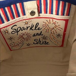 Charming tote with colorful heart pattern. Includes adjustable striped strap. Ideal for everyday use.
