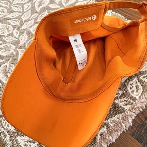Bright orange baseball cap with Lululemon logo. Perfect for casual wear. Athletic material