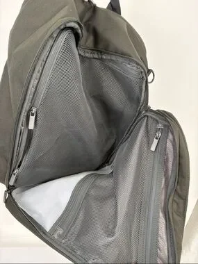 Compact rectangular backpack with a clean front pocket. Top carry handle and padded shoulder straps. Vertical zip pocket for small items. Smooth zipper secures the main compartment. Rugged fabric for everyday use. Great preowned condition. No issues. This has three main zip compartments with lots of pockets inside two of them. The back one is a lined padded laptop sleeve. There are two outside zip pockets. There is a trolley strap on the back and an additional strap if you want to carry it on one shoulder. approximately 18 inches tall 13 inches wide and 7 inches in depth. 🧷