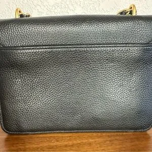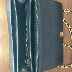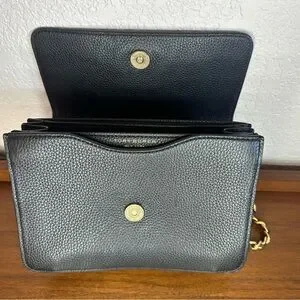 Sleek black leather with striking gold chain. Iconic Tory Burch logo. Perfect for day or night.