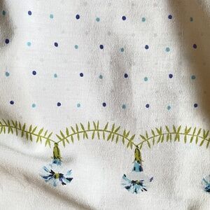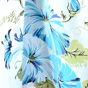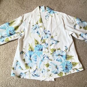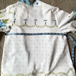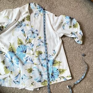 Upcycled cotton unlined open front printed jacket in a medium. 10-12. Unlined jacket has been made from a printed vintage tablecloth with a blue and green printed morning glory flower design. Open front with no closure. Loose fitting. 3/4 sleeves. Machine wash and dry. Iron as needed. PLEASE LOOK AT THE MEASUREMENTS TO ENSURE PROPER FIT AND ASK IF YOU HAVE QUESTIONS.