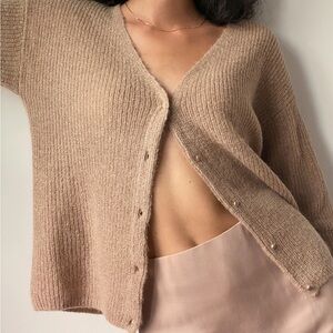 This is a button up, V-neck cardigan with a drop shoulder. This version of the Front to Back Cardigan is made with a soft and warm Italian yarn.