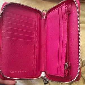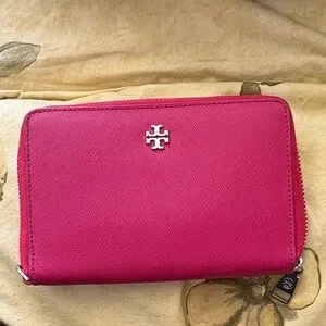 Bright pink leather wallet with zip-around closure. Features a metal Tory Burch logo on front. Interior offers multiple card and bill slots. Compact and stylish for everyday use.