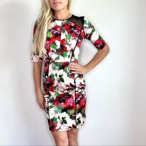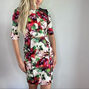 Milly New York dress, floral print sheath, mesh panel dress, piping detail, designer cocktail dress, floral midi, multicolored floral, luxury womenswear, Milly floral dress, size [Insert Size], wedding guest dress, sheer mesh shoulder, floral bodycon.
