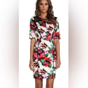 Keywords: Designer floral, Milly NY, structured sheath, colorblock, botanical, avant-garde, luxury contemporary, bodycon, pencil dress, spring fashion, summer floral, bright colors, power dressing, Revolve style, chic, vibrant print.