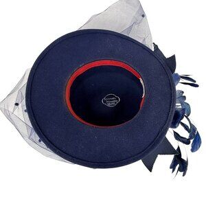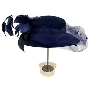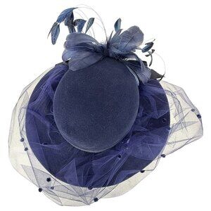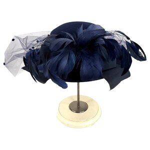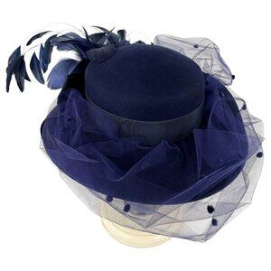 Elegant navy felt 100% wool hat with dramatic feather accents and layered tulle, offering timeless sophistication for formal events or costumes.