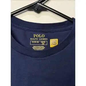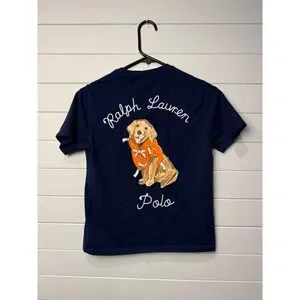 Very good gently used condition. Only worn a couple times. Few small slightly darker discolorations on shirt. Shirt has been washed and hung to dry but I didn't not notice spots and did not attempt spot treating so most likely would come out. A like do classic navy blue Polo Ralph Lauren t-shirt for kids featuring a playful graphic of a golden retriever wearing a life vest on the back. This short-sleeve tee also includes a small embroidered 'Polo' logo on the chest pocket. Perfect for casual outings, playground adventures, or family gatherings.