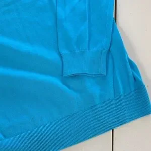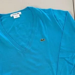 Bright turquoise V-neck sweater by Lacoste. Embroidered crocodile logo on chest. Fine knit for easy layering. Bold, eye-catching color. 100% cotton