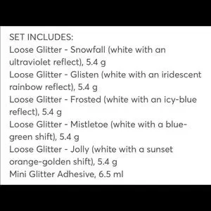 A limited-edition set containing five holiday-themed, full-size shades of loose glitter plus a mini glitter adhesive