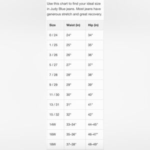 Judy Blue jeans run generous and are very stretchy compared to other brands. Judy Blue recommends sizing down one size in the skinny jeans, flares, and boot cuts and 2 sizes in the boyfriends or relaxed denim.
