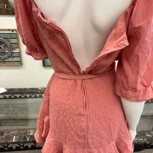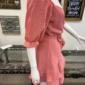 Beautiful and romantic wrap‑style dress in a soft rose‑pink tone with a subtle textured pattern. This dress features elegant puff sleeves with gathered cuffs, a flattering deep V‑wrap neckline, and a matching tie belt that allows for an adjustable, waist‑accentuating fit. The tiered ruffle hem adds movement and charm, creating a flowy, feminine finish perfect for many occasions.
