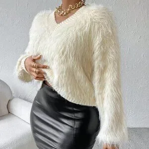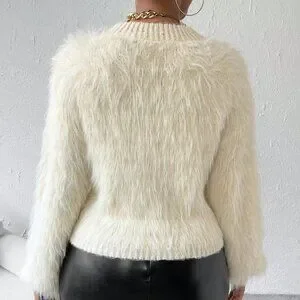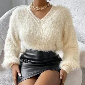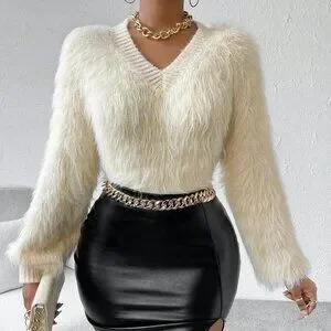White Preppy womens Solid V Neck Fuzzy Knit Sweater