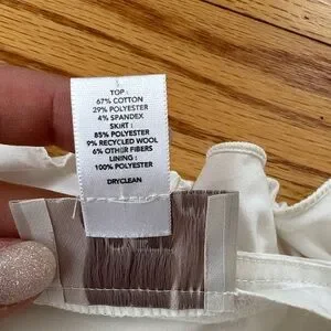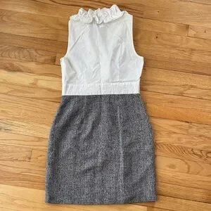 Sleeveless dress with ruffled V-neck bodice. White top paired with gray tweed skirt. Fitted pencil silhouette with front seam pockets. Polished and feminine style.