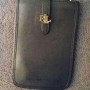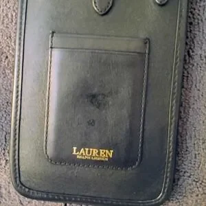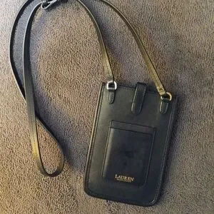 Sleek black leather crossbody phone case by Lauren Ralph Lauren. Front card pocket for quick access. Adjustable shoulder strap for easy wear. Subtle gold-tone logo adds polish.
