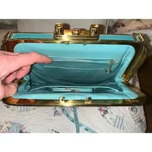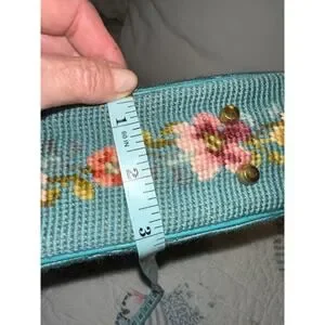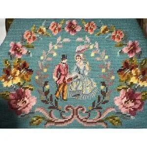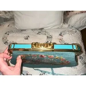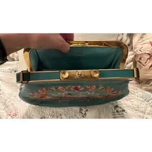 THIS INCREDIBLE LARGE BAG HAS NEVER BEEN USED AND IS IN NEW CONDITION. IT HAS IT ALL! (LOOKS SMALLER IN PHOTOS). THE TEAL COLOR IS OUTSTANDING AND THE NEEDLEPOINT DESIGN IS THE SAME FRONT AND BACK. THE COURTING COUPLE IN THE MIDDLE ARE DONE IN PETITPOINT. THE FRAME IS INLAID IN TEAL LEATHER AND FEATURES AN UNUSUAL BRASS CLASP WHICH WORKS BY PRESSING THE TWO CYLINDERS TOGETHER. THE INSIDE IS LINED IN SUPERSMOOTH TEAL LEATHER AND. HAS ONE ZIPPERED AND TWO UNZIPPERED COMPARTMENTS. THERE IS A SEPARATE TEAL LEATHER CHANGE PURSE WHICH COMES WITH THE BAG. THERE ARE 4 BRASS FEET ON THE BOTTOM OF THE BAG. IT IS QUITE LARGE, MEASURING 13 X 11 X 3 INCHES. THERE IS NO HANDLE SO YOU CAN ADD ANY TYPE YOU LIKE (SHOULDER, CROSSBODY, HAND STRAP) AND ATTACH IT TO THE BRASS RINGS. THIS IS NOT THE USUAL VINTAGE NEEDLEPOINT BAG - IT IS A SHOWPIECE!!