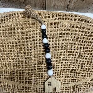 Decorative wood bead garland featuring alternating black and white beads with a natural jute tassel and carved wood house charm. A perfect accent piece for farmhouse, modern rustic, or neutral home decor styles.