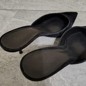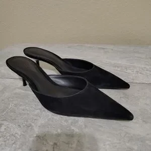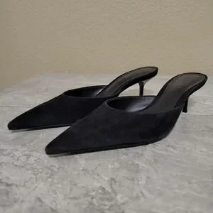 Women’s black suede mule heels size 7 with pointed toe and slip-on silhouette. Julie mules feature a sleek low stiletto heel and minimalist design.